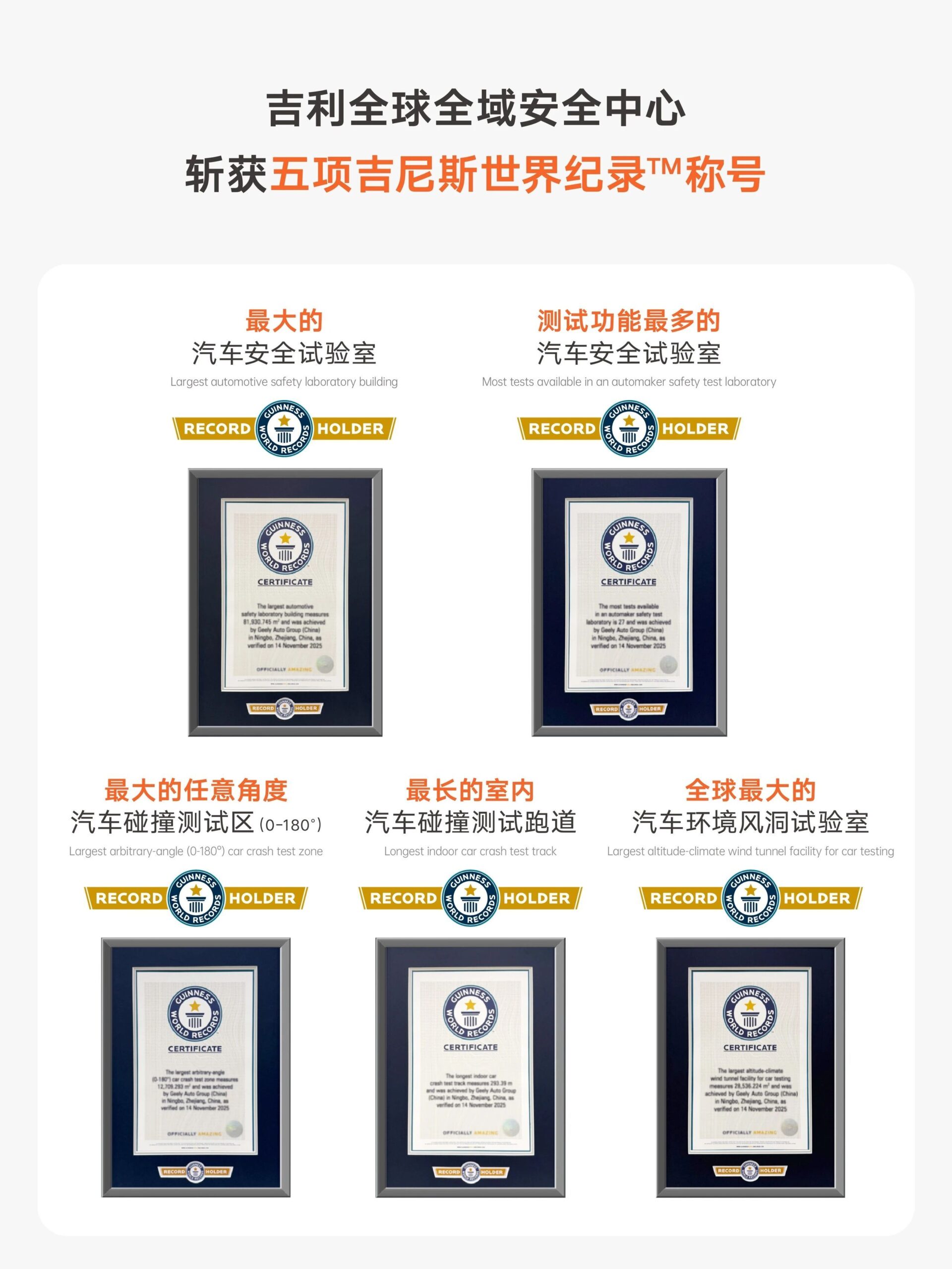 Grupul chinez Geely Auto a inaugurat oficial, pe 12 decembrie 2025, Centrul Global de Siguranță All-Domain din Hangzhou Bay, provincia Zhejiang, China. Această platformă devine cel mai mare laborator de testare a siguranței auto la nivel mondial, cu o suprafață construită de 81.930,745 m², stabilind nu mai puțin de cinci recorduri mondiale Guinness simultan. Investiția depășește 2 miliarde de yuani (peste 240 milioane euro), iar centrul beneficiază și de expertiza în siguranță a subsidiarei Volvo, deținută de Geely.