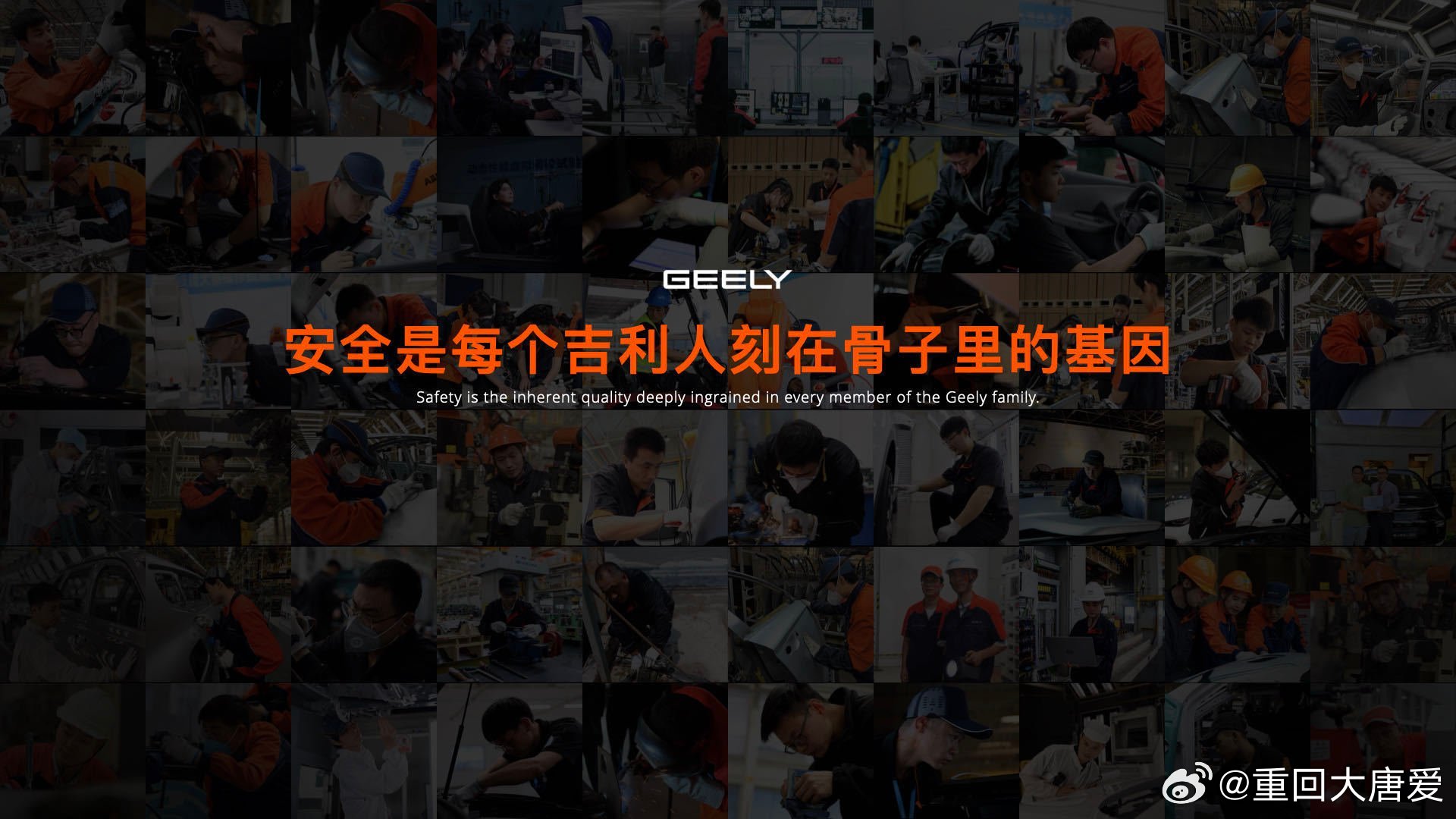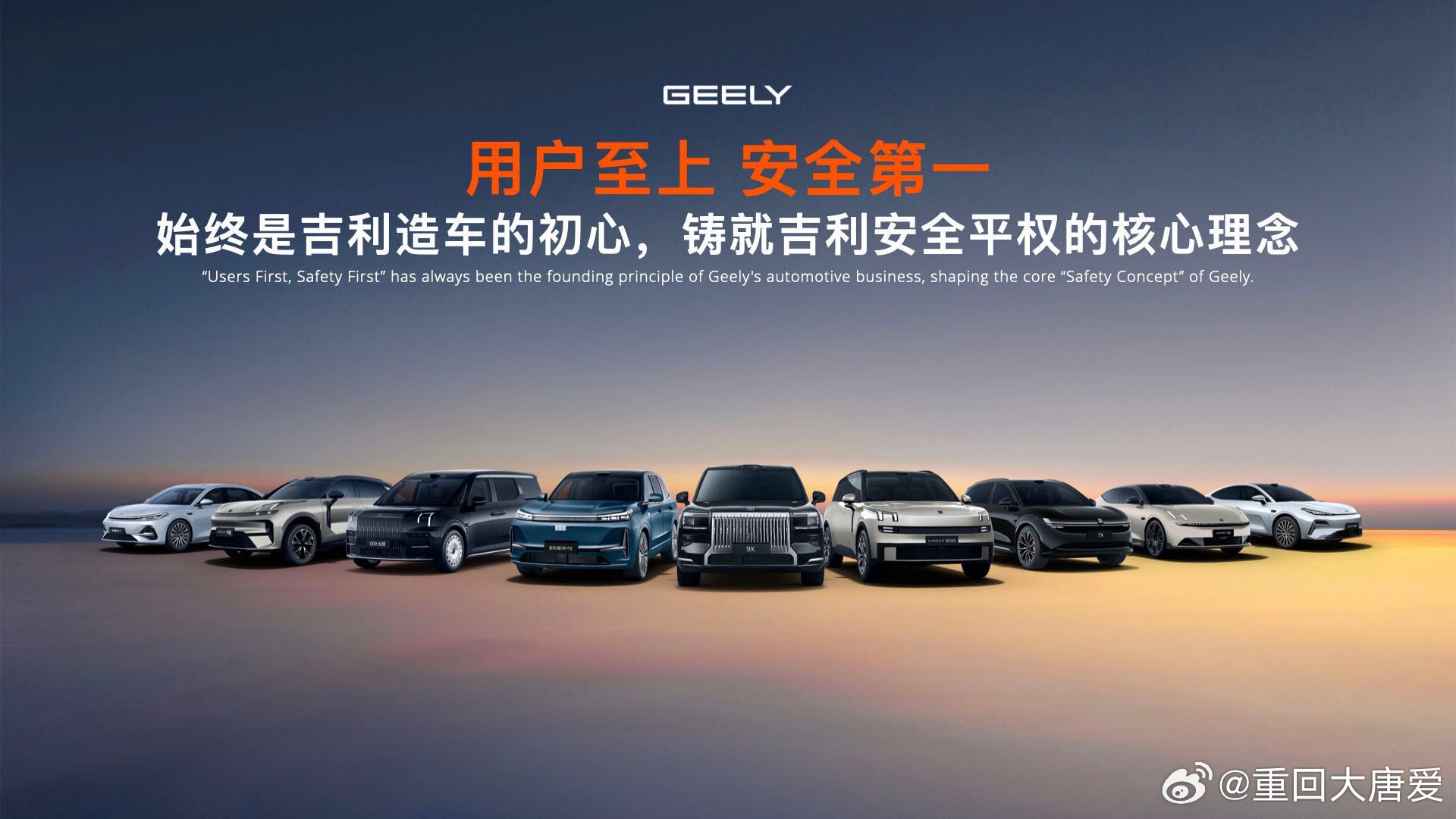 Siguranța a fost întotdeauna prioritatea absolută a Geely. Încă din 2000, președintele Li Shufu a ordonat distrugerea a sute de vehicule Haoqing neconforme calitativ. În 2007, Declarația de la Ningbo a stabilit „siguranța pe primul loc” ca strategie supremă de cercetare-dezvoltare. Achiziția Volvo în 2010 a permis integrarea profundă a genelor de siguranță scandinave, ducând la arhitecturi precum CMA și SEA, caroserii de înaltă rezistență și cabine sănătoase.
