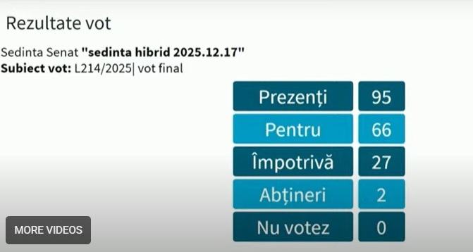 La ședința în format hibrid de miercuri, dintre cei 95 de senatori prezenți au votat pentru 66, împotrivă, 27 și au fost două abțineri, conform rezultatelor în timp real din plen.