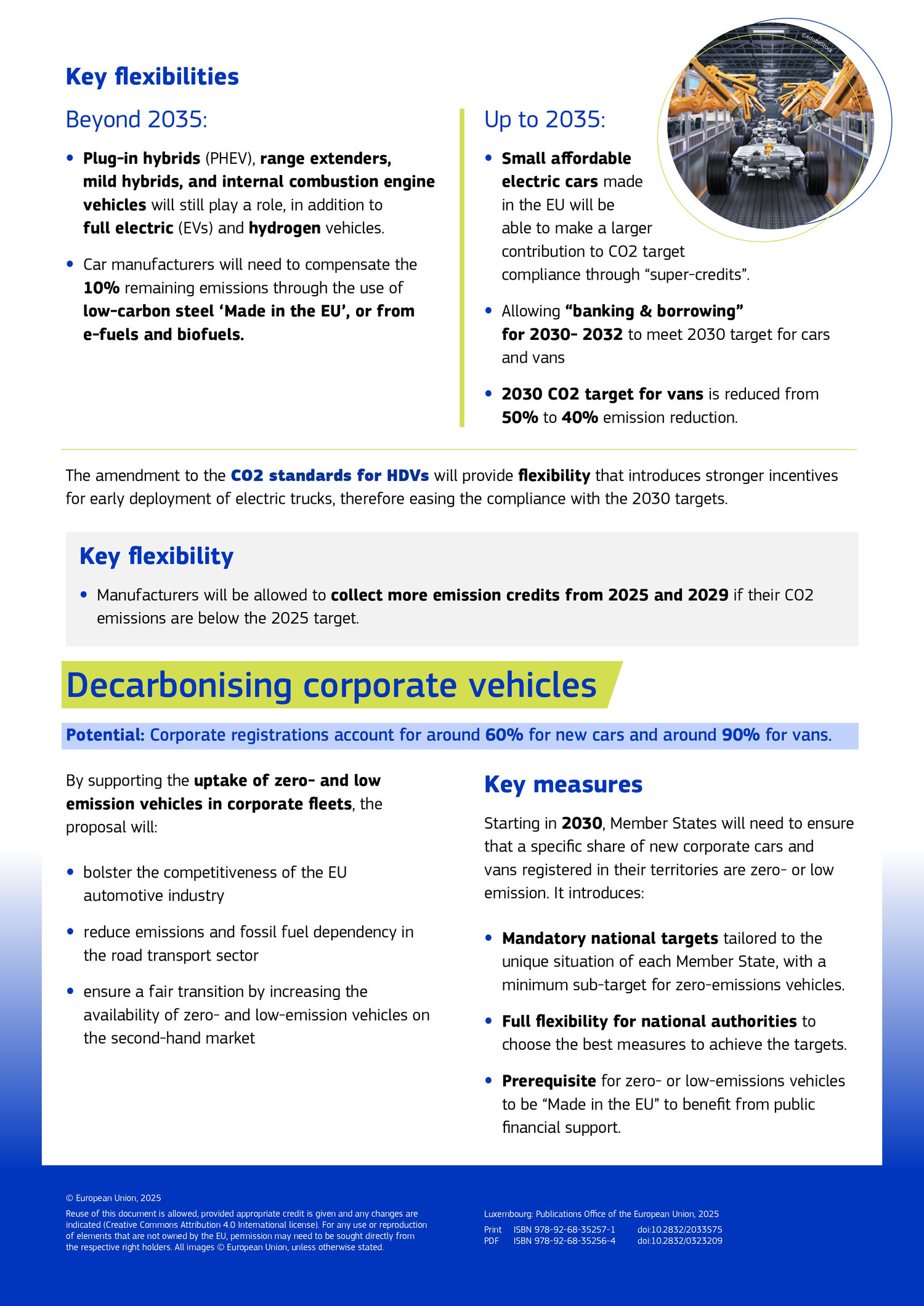 Până în 2035, producătorii vor beneficia de „super credite” pentru mașini electrice mici și accesibile produse în UE, care vor conta ca 1.3 în loc de 1 la conformarea cu țintele CO2. Pentru ținta din 2030 la mașini și furgonete, se va introduce flexibilitatea „banking & borrowing” (mecanisme de flexibilitate care permit companiilor să păstreze certificatele de emisii neutilizate pentru anii viitori sau să utilizeze în avans o cotă din certificatele alocate pentru anul următor pentru a-și acoperi deficitul actual) în perioada 2030-2032. Pentru furgonete, unde adoptarea electrică a fost mai dificilă structural, ținta de reducere a emisiilor de CO2 din 2030 scade de la 50 la 40%.