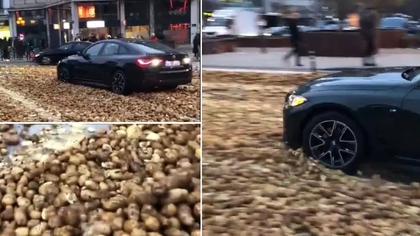 (video) Un șofer a rămas împotmolit cu BMW-ul în cartofii aruncați pe stradă de fermieri, la protestul din Bruxelles