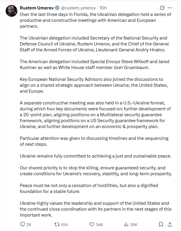 „Ucraina rămâne pe deplin angajată în realizarea unei păci juste și durabile”, au afirmat Umerov și Witkoff. „Prioritatea noastră comună este să oprim uciderile, să asigurăm securitatea garantată și să creăm condiții pentru redresarea, stabilitatea și prosperitatea pe termen lung a Ucrainei”, se arată în declarație, conform News.ro.