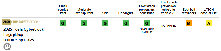 În testele anterioare sau parțiale, Cybertruck nu ar fi îndeplinit criteriile pentru Top Safety Pick+ din cauza cerințelor înăsprite ale IIHS pentru 2025, care impun calificativ „Good” (nu doar „Acceptable”) în anumite teste. Aceste standarde mai dure au dus la o scădere cu 20% a numărului total de premii Top Safety Pick+ în 2025 față de 2024 (66 câștigători + doar 18 care au obținut Top Safety Pick).