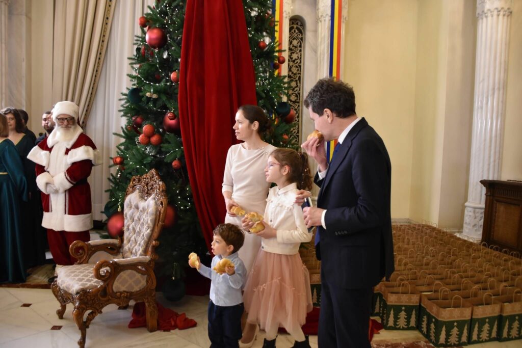 În timpul reprezentației de colinde din sala mare a Palatului Cotroceni, Nicușor Dan și familia sa au primit colaci tradiționali din partea artiștilor invitați.