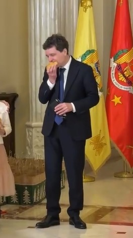 Președintele, fără să mai țină cont de nimic, a început să muște cu poftă din colăcei, asemenea, fiului său în vârstă de câțiva anișori.