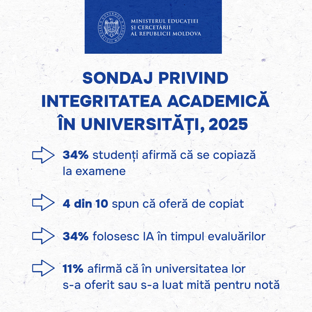 Aproape 34% dintre studenți afirmă că se copiază la examene, iar circa patru din zece recunosc că oferă de copiat colegilor. Totodată, 34% dintre respondenți declară că folosesc inteligența artificială în timpul evaluărilor, iar 11% susțin că, în universitatea lor, s-a oferit sau s-a luat mită pentru notă sau pentru promovarea anului de studii. Datele se regăsesc în studiul privind integritatea academică în universitățile din Republica Moldova, lansat recent de Ministerul Educației și Cercetării (MEC).