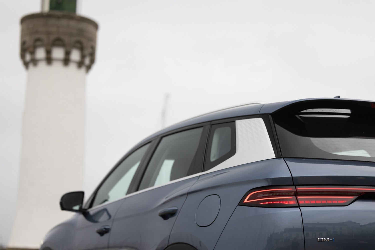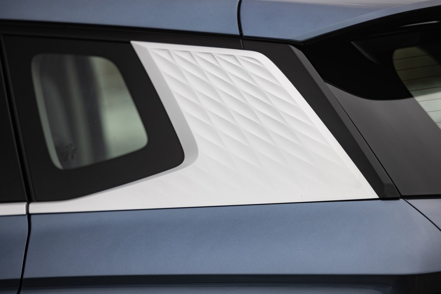 - Profil lateral cu suprafețe clare în panourile inferioare, umeri musculoși peste arcurile roților și montanți D în culoare contrastantă pentru efect de plafon „plutitor”.
