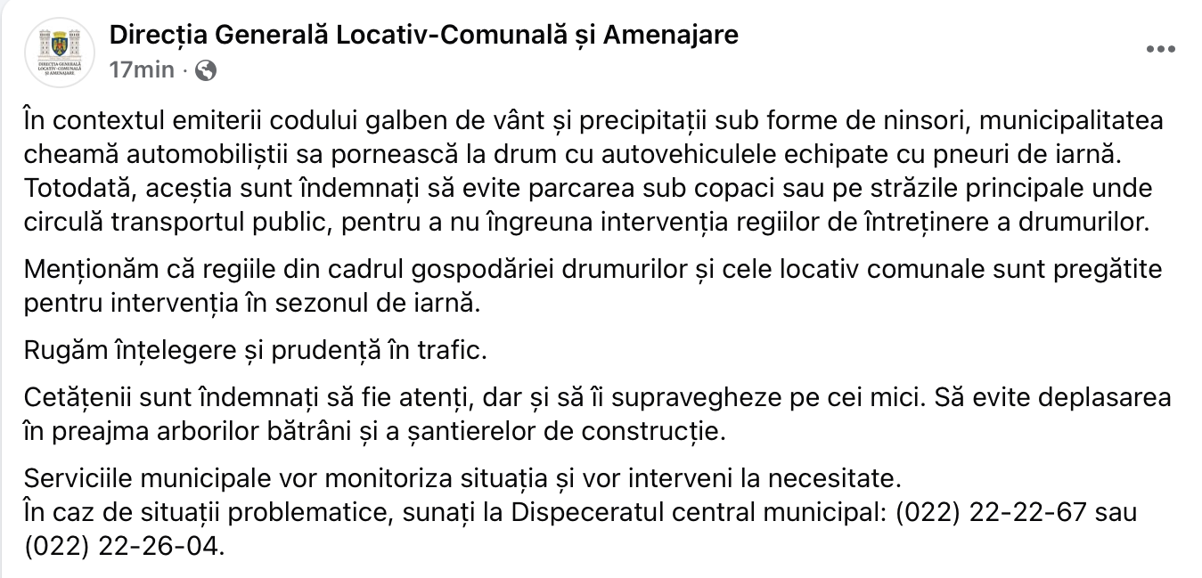 Direcția locativ-comunală din Capitală sugerează șoferilor să nu parcheze sub copaci sau pe străzile principale, pe unde circulă transportul public, pentru a nu periclita intervenția tehnicii de curățare și întreținere a drumurilor.