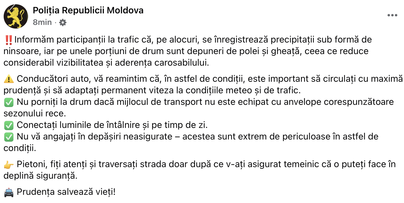 Poliția recomandă automobiliștilor să nu pornească la drum dacă vehiculul nu este echipat cu anvelope corespunzătoare sezonului rece. Luminile de întâlnire trebuie conectate și pe timp de zi, iar depășirile neasigurate și periculoase – evitate.