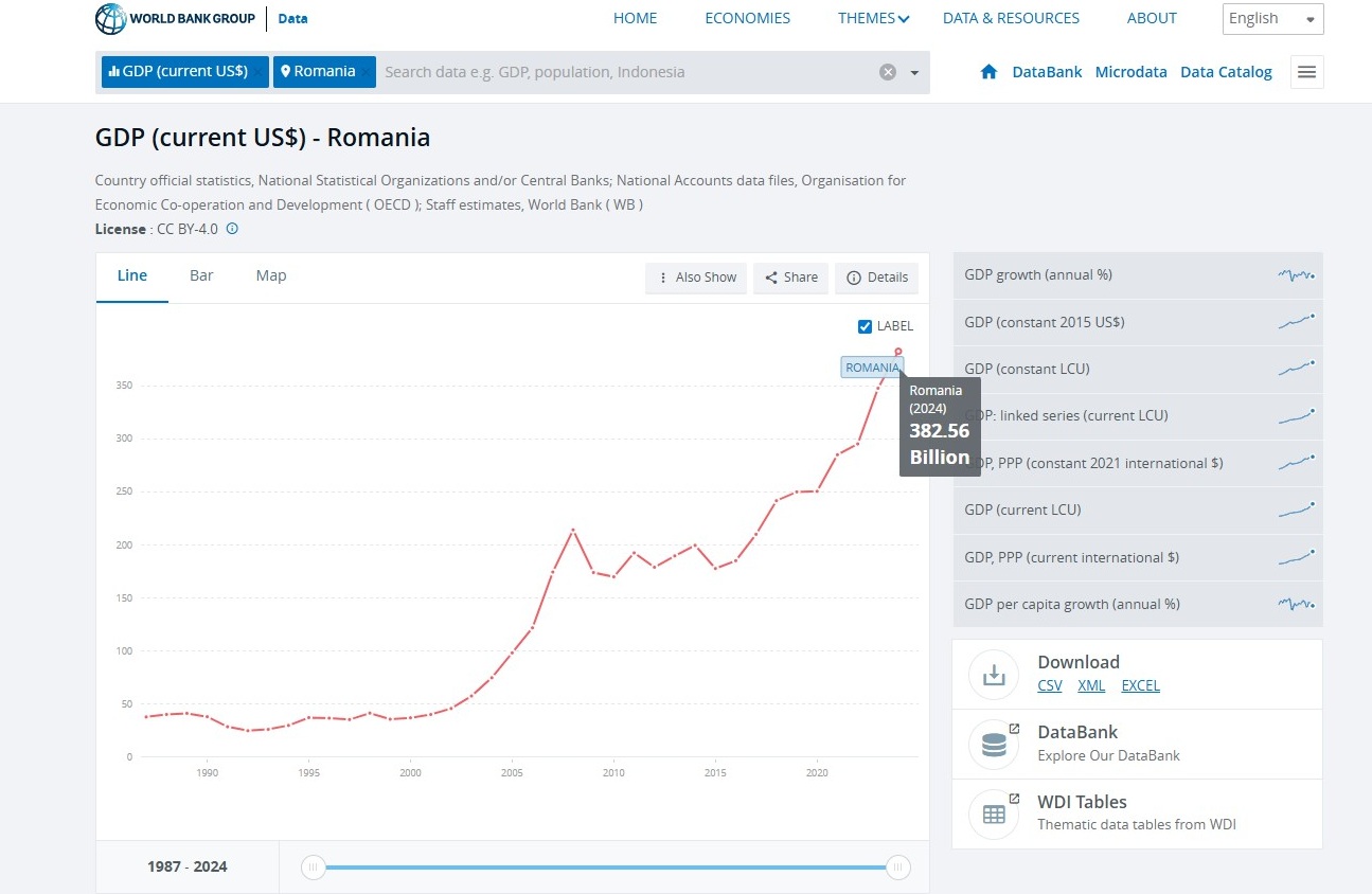 Datele Băncii Mondiale sunt publicate online începând cu anul 1987, când PIB-ul României socialiste era de 38,07 de miliarde de dolari.