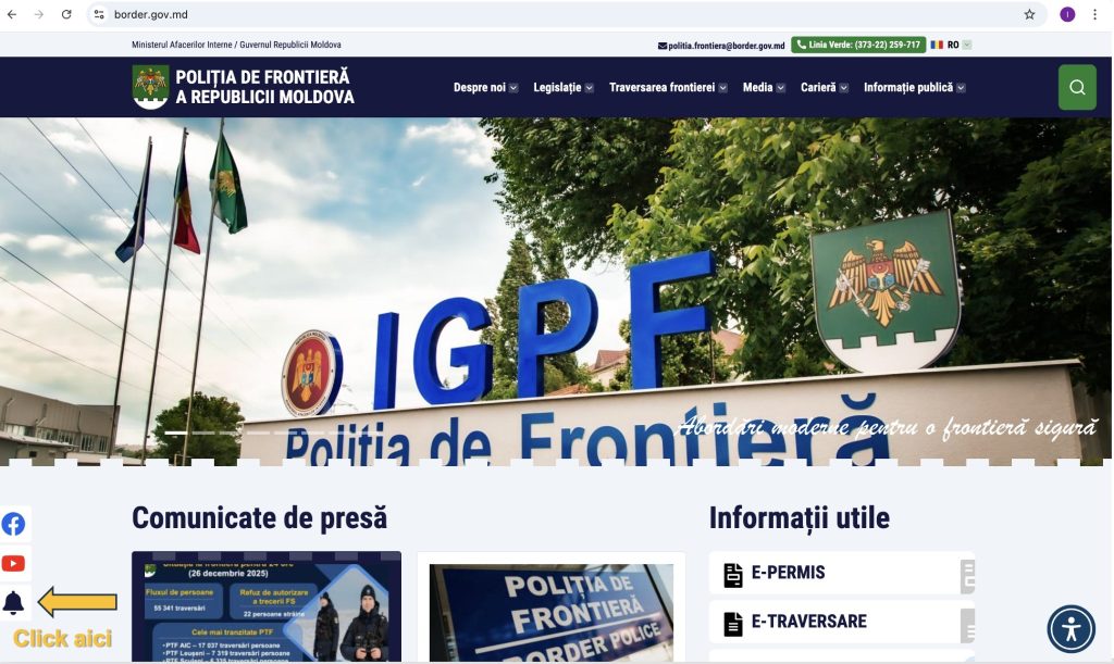 Pagina oficială a Poliția de Frontieră a fost completată cu un instrument nou care permite abonarea rapidă la notificări, printr-un singur click. Pe site a fost introdus un clopoțel de notificare, amplasat în partea stângă a paginii, prin intermediul căruia utilizatorii pot primi instantaneu informații oficiale.