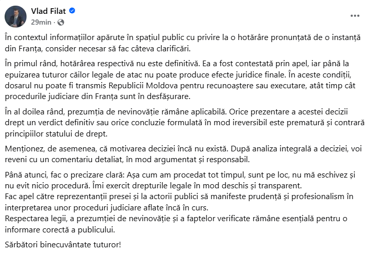 Menționez, de asemenea, că motivarea deciziei încă nu există. După analiza integrală a deciziei, voi reveni cu un comentariu detaliat, în mod argumentat și responsabil”, se mai arată în mesajul lui.