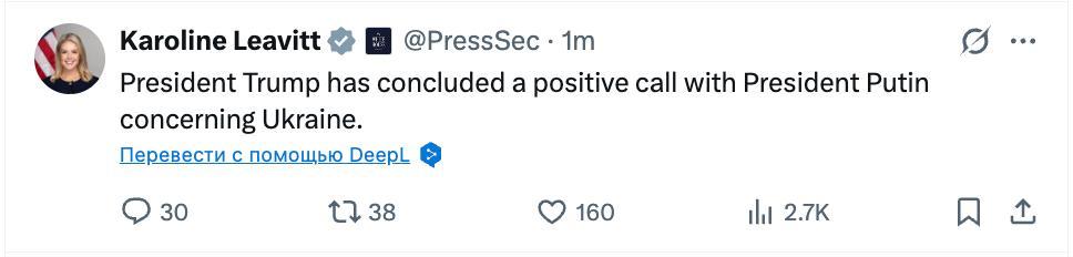 Președintele Statelor Unite, Donald Trump a avut o „convorbire telefonică pozitivă” cu președintele rus Vladimir Putin pe tema Ucrainei, a anunțat secretara de presă al Casei Albe, Caroline Levitt, într-un comunicat oficial.