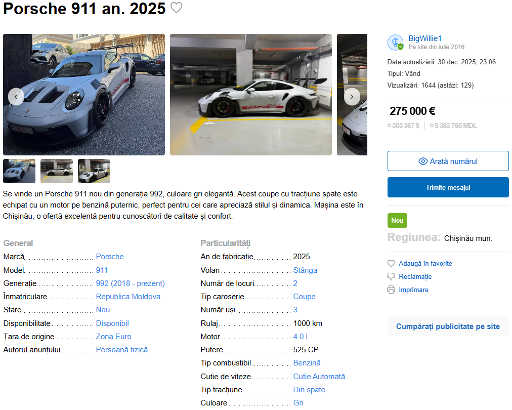 În Chișinău a apărut la vânzare un Porsche 911 GT3 RS de ultimă generație. Este primul automobil de acest gen pentru care se caută public un al doilea proprietar. Deși exemplarul are un parcurs declarat de 1000 de km, este considerat drept nou.