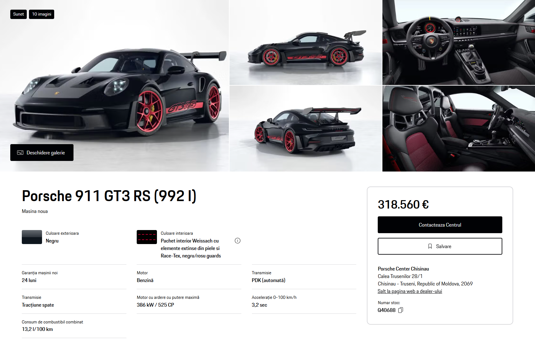 Amintim că noul Porsche 911 GT3 RS a fost prezentat în august 2022 și până în prezent în Republica Moldova au fost importate mai puțin de 10 unități. Prețul de start îi era atunci de 235.000 de euro.