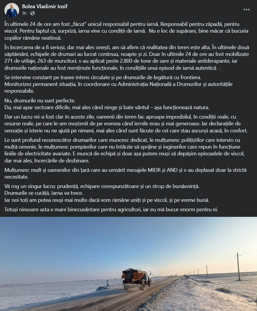 Ministrul Bolea afirmă că, în ultimele două săptămâni, echipele de întreținere a drumurilor au lucrat continuu, zi și noapte, pentru a menține circulația în condiții de iarnă autentică. Datorită acestor eforturi, drumurile naționale au rămas funcționale chiar și în plin episod de viscol.