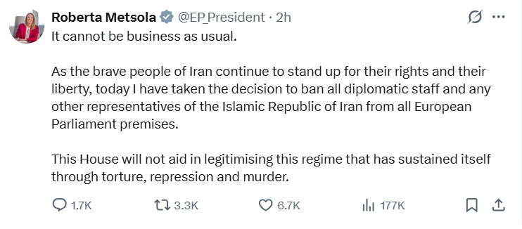 Președinta Parlamentului European, Roberta Metsola, a anunțat luni, 12 ianuarie, interzicerea accesului diplomaților iranieni în toate sediile instituției. Măsura vine ca răspuns la represiunea violentă declanșată de regimul de la Teheran împotriva protestatarilor.