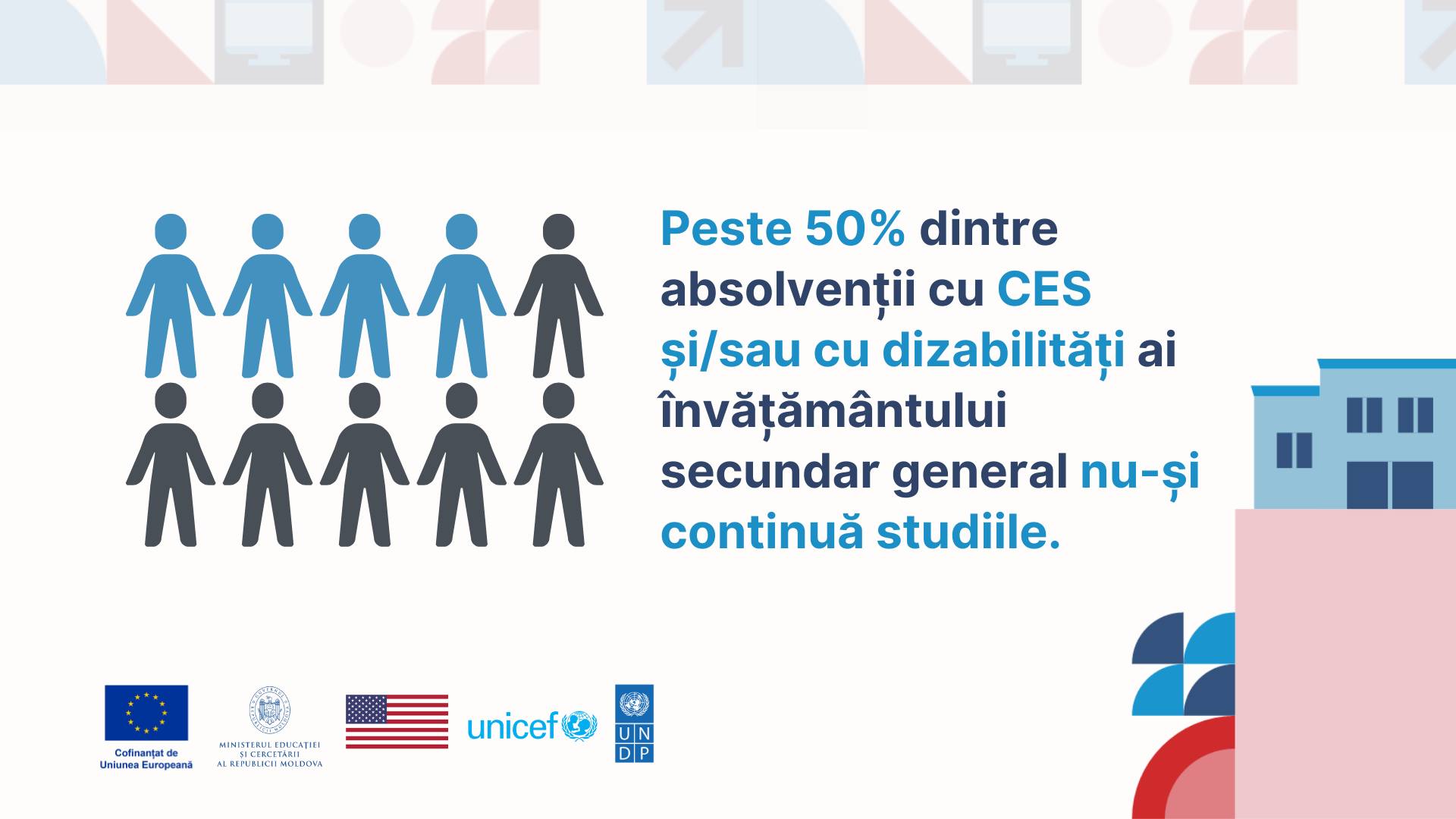 Peste 50% dintre absolvenții cu cerințe educaționale speciale sau dizabilități din Republica Moldova nu își continuă studiile după finalizarea învățământului secundar general, potrivit unei analize privind educația incluzivă, realizată cu sprijinul UNICEF.