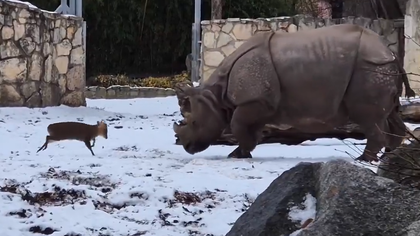 (video) Moment viral la o grădină zoologică din Polonia: Un cerb minuscul provoacă un rinocer de 1,7 tone. Cum s-a terminat confruntarea