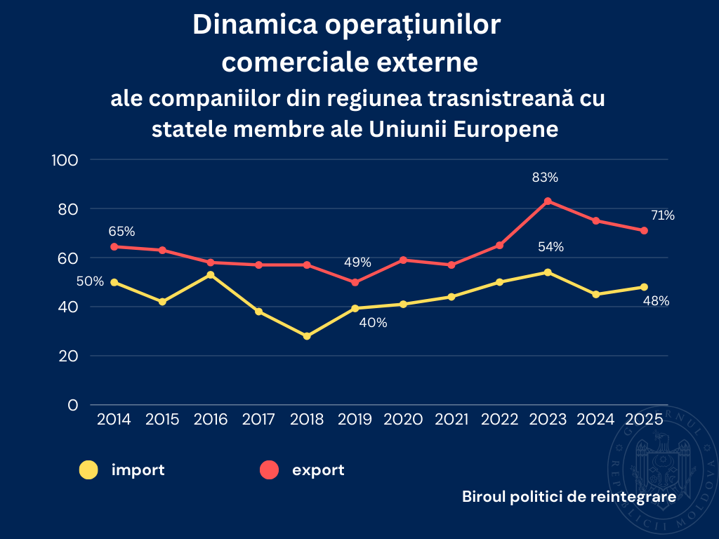 Exporturile agenților economici din regiunea transnistreană către statele membre ale Uniunii Europene au constituit, în anul 2025, 71% din totalul livrărilor externe, potrivit Biroului Politici de Reintegrare.