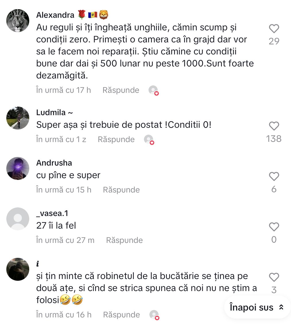 Unii au menționat că nu este singura problemă a căminului, pe când alții s-au plâns pe taxele impuse pentru cazare.