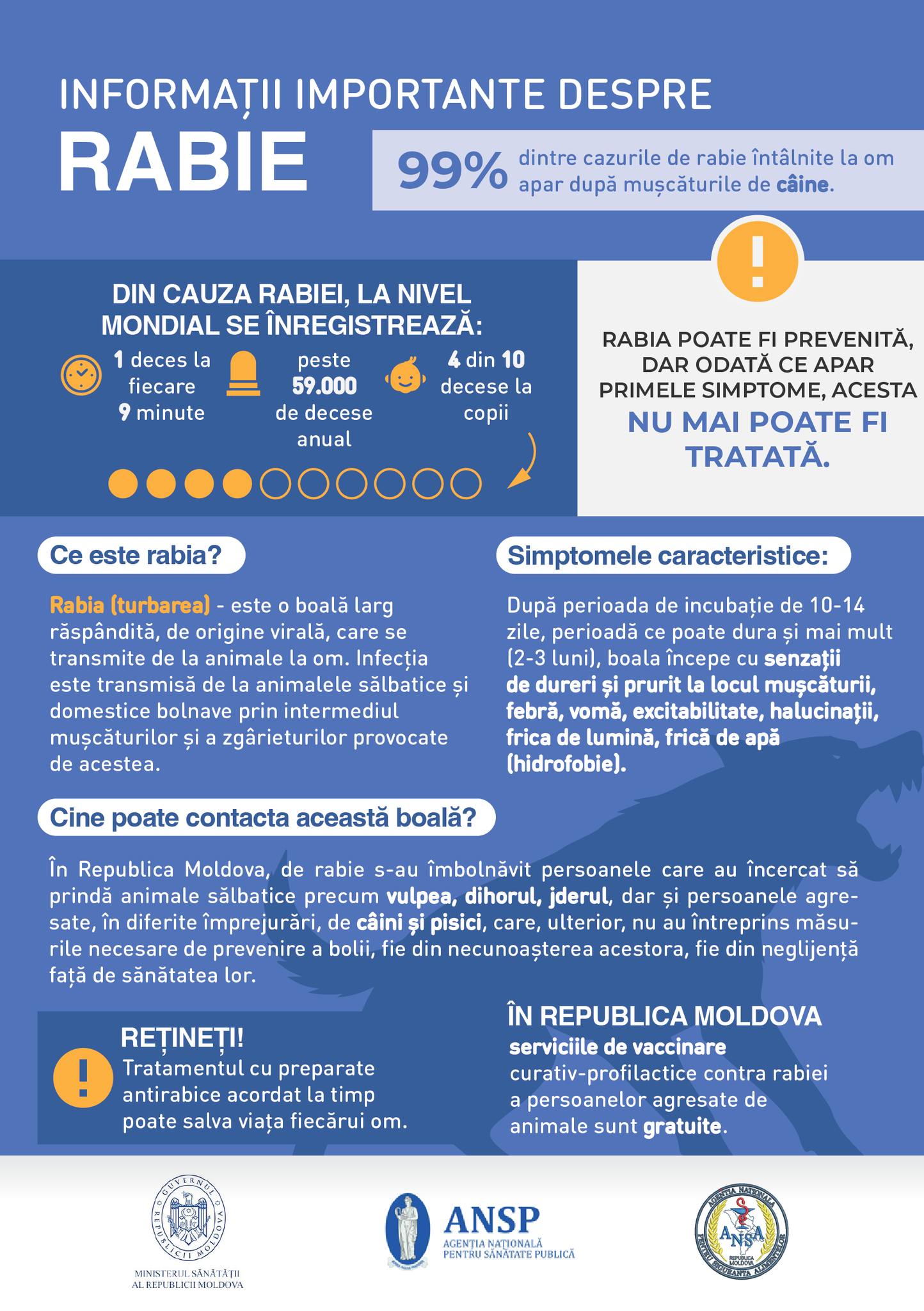 Autoritățile reamintesc că rabia este mortală, dar poate fi prevenită prin vaccinare, iar tratamentul antirabic este gratuit dacă este administrat la timp.
