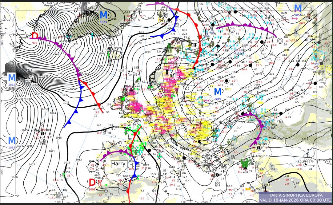Ultima hartă sinoptică valabilă pentru 18 ianuarie 2026 indică o situație de blocaj la nivelul continentului european. Se remarcă persistența anticiclonului est-european, lobat dinspre zona Munților Ural peste jumătatea de est a Europei. Există și prezența a două zone ciclonice active – una în nord-vestul Oceanului Atlantic (la est de Islanda) și alta între Peninsula Iberică și nord-estul Africii.