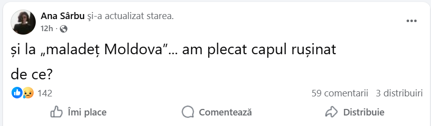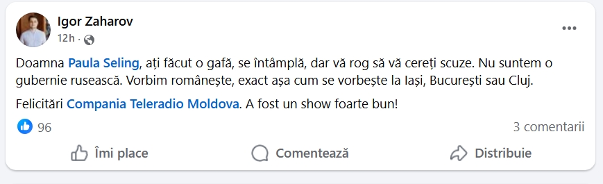 „Am reuşit să aduc un moment total neintenţionat în faţa fraţilor mei din Republica Moldova. Încercând să fiu drăguţă şi simpatică, am folosit un cuvânt care habar nu aveam că este în limba rusă fără să ştiu că va crea supărare. Aflând că e în rusă, am înţeles de ce”, a explicat artista.