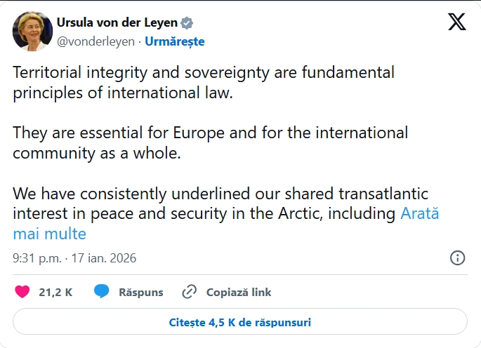 „Europa va rămâne unită, coordonată și angajată să își apere suveranitatea”, a scris șefa executivului european pe platforma X.