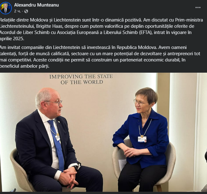 În cadrul Forumului Economic Mondial, premierul moldovean a avut și o întrevedere cu prim-ministra Liechtensteinului, Brigitte Haas. Potrivit lui Alexandru Munteanu, discuțiile s-au axat pe angajamentul comun de a valorifica oportunitățile oferite de Acordul de Liber Schimb cu Asociația Europeană a Liberului Schimb (EFTA).