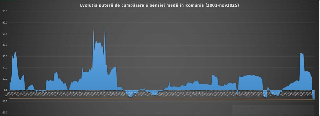 Despre scăderea record a puterii de cumpărare în ultima parte a anului 2025. În anul 2025, pensiile au fost înghețate. Pe fondul măsurilor de austeritate luate în a doua jumătate a anului 2025 (creșterea TVA general și a TVA redusă, inclusiv la alimente și produse de bază; creșterea accizelor; CASS crescut s.a.m.d), inflația a explodat de la 5% în prima parte a anului la 10% în a doua parte a anului.