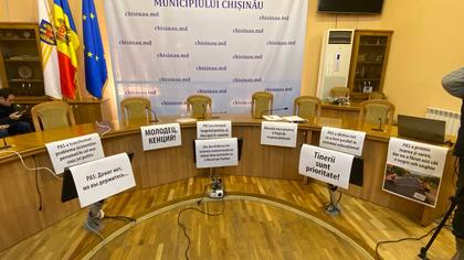 Prima ședință a Consiliului Municipal Chișinău a început, astăzi, cu mai multe mesaje scrise pe pancarte, de către aleșii MAN, la adresa celor din PAS.