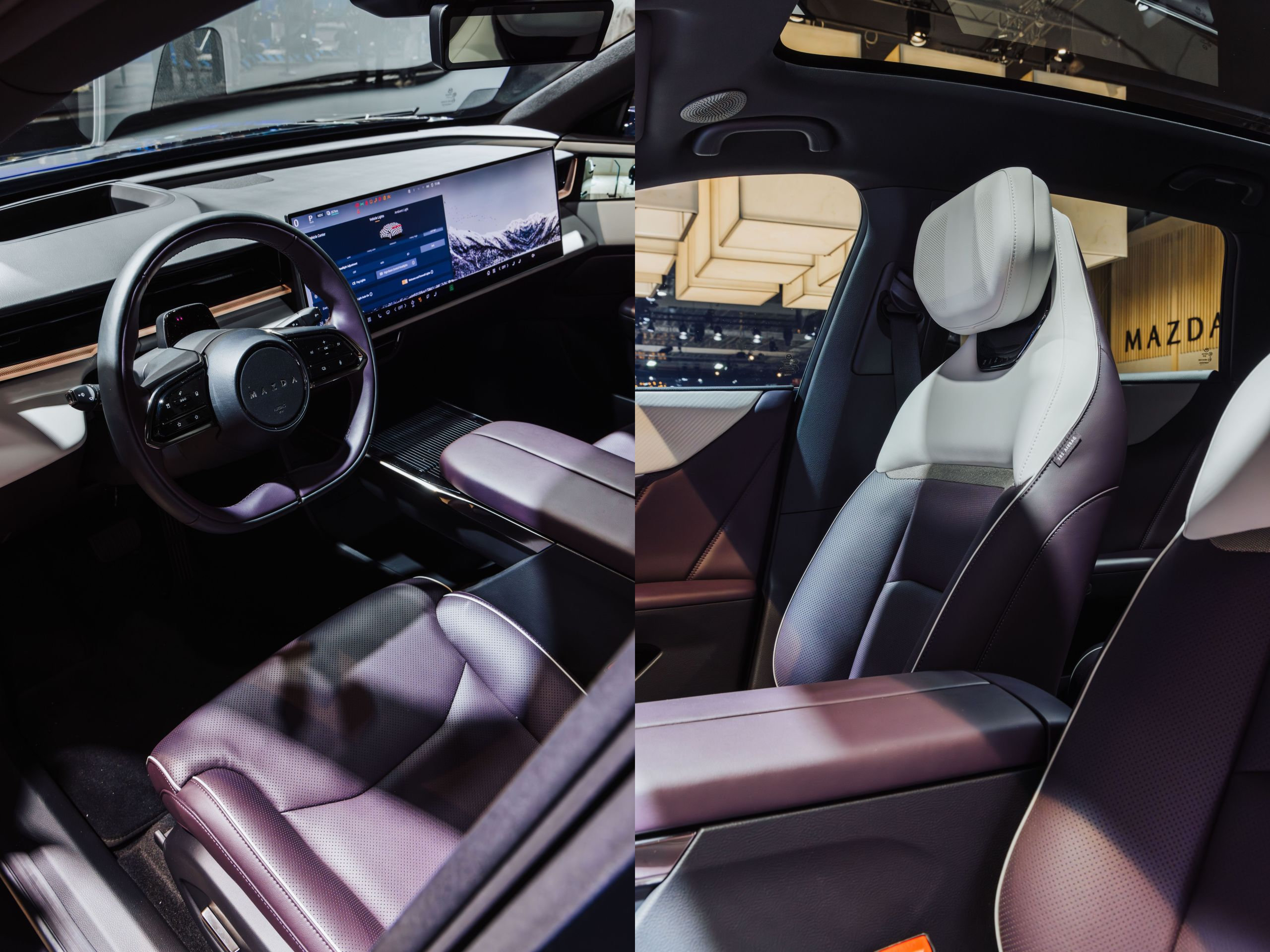 Interiorul, momentan inaccesibil publicului la stand, include un monitor central de 26 inchi (5K rezoluție) și sistem audio premium cu 23 de difuzoare (1280 W). Oglinzile retrovizoare sunt înlocuite cu camere video (dotare opțională). Mazda promite materiale de calitate ridicată, scaune ventilate și un pachet complet de sisteme de siguranță: cruise control adaptiv, menținere în bandă, frânare de urgență și monitorizare 360°.