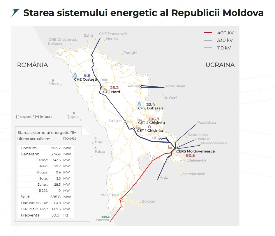 Curentul electric va fi restabilit complet până la ora 18:00, transmite Newsmaker.md. În același timp, datele operatorului rețelei de transport Moldelectrica arată că blocul energetic al MGRES a fost repornit.