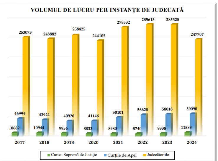În intervalul 2017–2023, numărul cauzelor noi înregistrate anual la toate cele trei niveluri de instanță a crescut de la 310.749 la 352.684, adică un avans de aproximativ 12%, o evoluție similară cu cea observată în alte state din regiune.