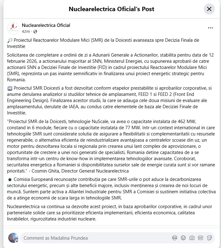 „Comisia Europeană recunoaște contribuția pe care SMR-urile o pot aduce la decarbonizarea sectorului energetic, precum și alte beneficii majore, inclusiv menținerea și crearea de noi locuri de muncă. Suntem parte activă a Alianței Industriale pentru SMR a Comisiei și susținem inițiativa colectivă de a atinge economii de scară largă în tehnologiile SMR. Nuclearelectrica va continuă să dezvolte acest proiect, în baza aprobărilor corporative, în cadrul unor parteneriate solide care să prioritizeze eficientă implementării, eficientă economică, calitatea livrabilelor, rigurozitatea industriei nucleare”, a comunicat compania pe Facebook.