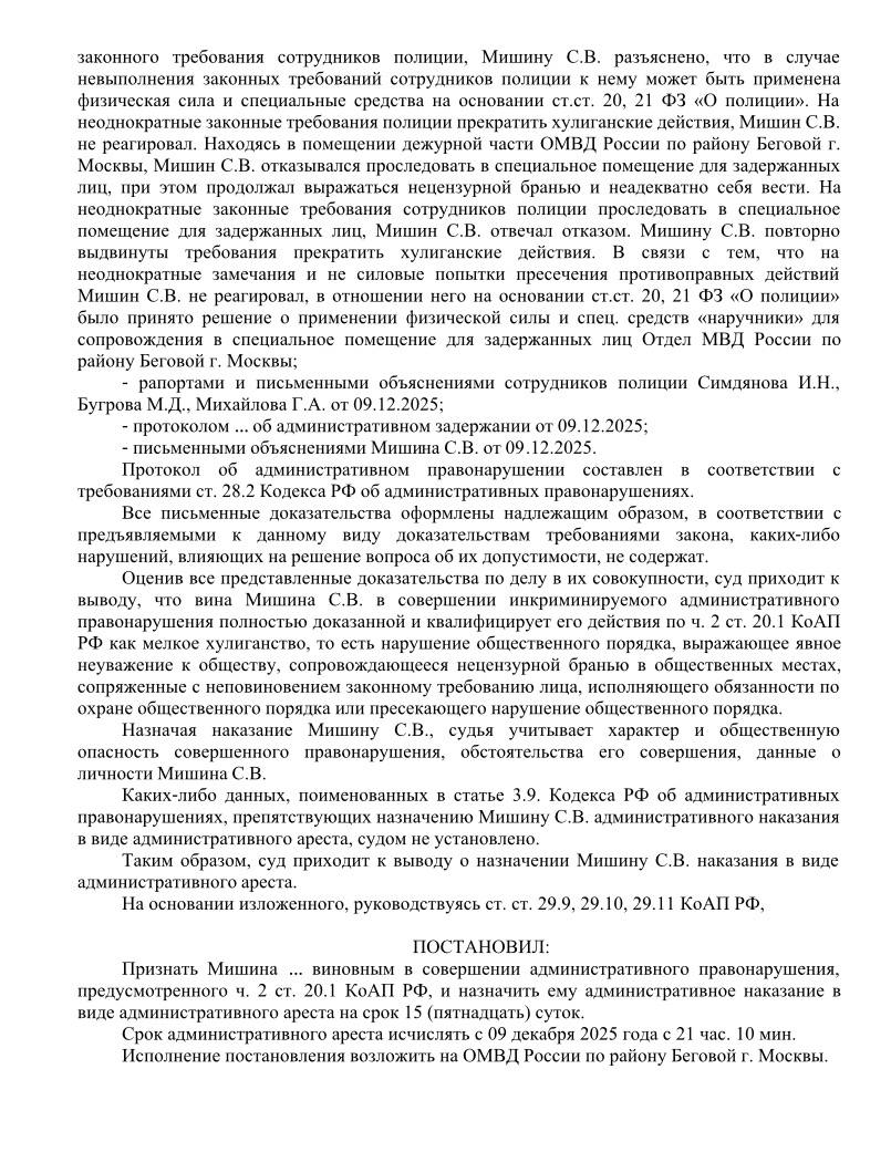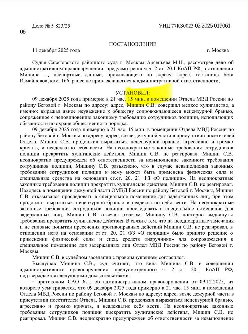 În documentele publicate de canalul de Telegram SPPOT se arată că Mișin a ajuns la secția de Poliție în seara de 9 decembrie, nu s-a supus solicitărilor forțelor de ordine și ar fi folosit limbaj licențios. Pe 11 decembrie, pe acest caz, judecătorii ruși i-au aplicat pedeapsa administrativă sub formă de arest, pentru 15 zile.