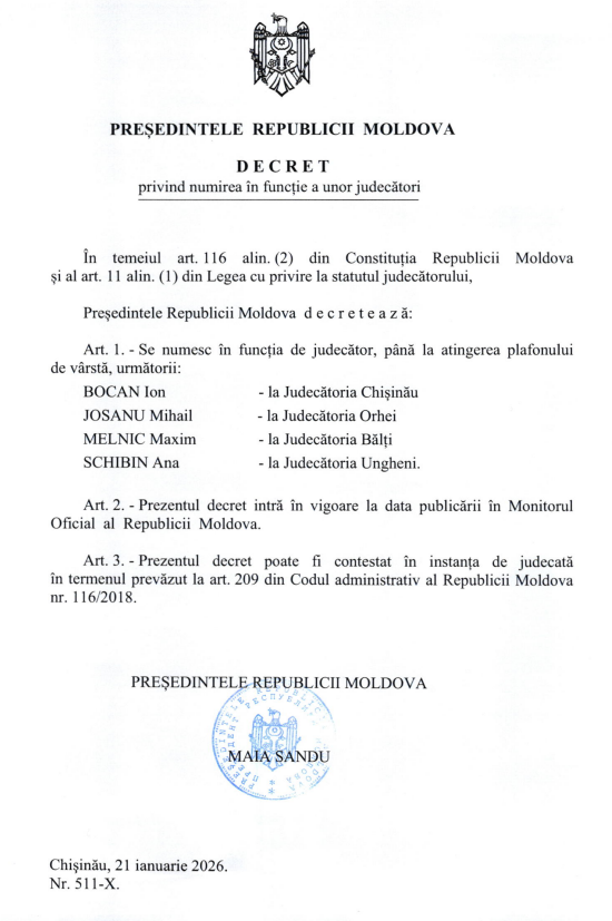 Potrivit documentului, în funcția de judecător au fost numiți Ion Bocan – la Judecătoria Chișinău; Mihail Josanu – la Judecătoria Orhei; Maxim Melnic – la Judecătoria Bălți; Ana Schibin – la Judecătoria Ungheni.
