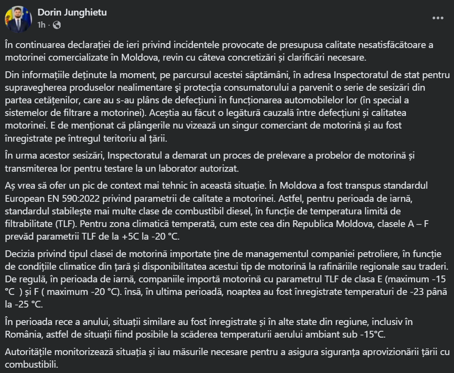 Ministrul Energiei, Dorin Junghietu, a revenit în această seară, urmare a declarațiilor de ieri, cu precizări în legătură cu sesizările masive ale șoferilor privind calitatea motorinei comercializate în Republica Moldova. Declarațiile vin după plângerile numeroase înregistrate în ultimele zile și după ce Inspectoratul de Stat pentru Supravegherea Produselor Nealimentare și Protecția Consumatorului a primit o serie de reclamații înregistrate.