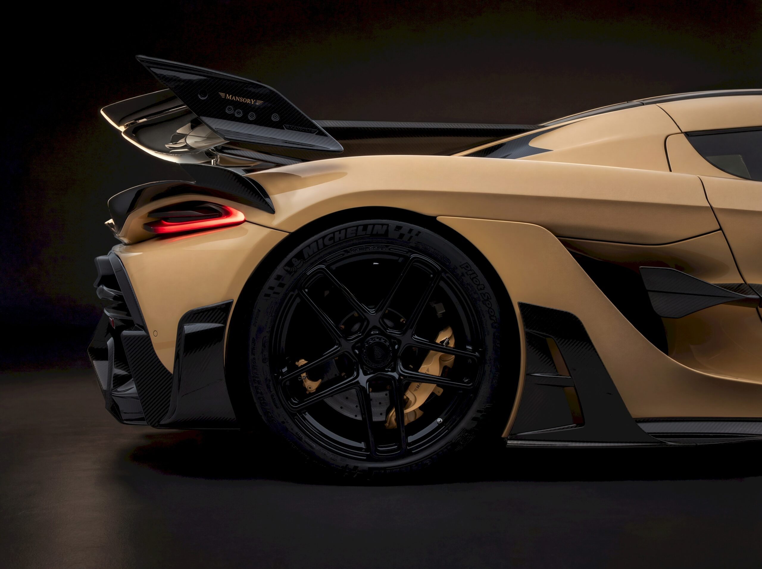 Modificările includ: capotă cu capac, flaps-uri laterale față cu două aripi de curse, elemente aerodinamice spate (add-on-uri aero, flaps-uri laterale spate și secțiune centrală nouă pentru difuzor), două boomerang-uri frontale noi, add-on-uri verticale și un roof scoop nou pentru răcire superioară a motorului. Pentru un aspect unitar, Mansory a mai adăugat „sprâncene” în spate și încă un stop de curse, tot din carbon.
