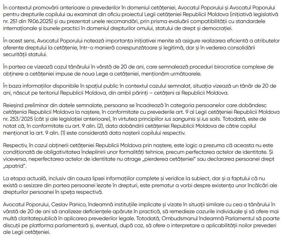 Ombudsmanul precizează că, potrivit informațiilor apărute în spațiul public, tânărul s-a născut în Republica Moldova, din ambii părinți cetățeni moldoveni, ceea ce înseamnă că dobândește cetățenia Republicii Moldova la naștere. În acest context, Avocatul Poporului subliniază că neperfectarea actelor de identitate nu condiționează cetățenia.