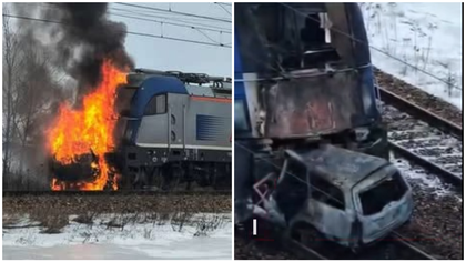 (foto/video) „Am văzut locomotiva în flăcări, iar sub ea o mașină.” Două trenuri cu 600 de oameni la bord s-au ciocnit cu un Ford blocat pe șine, în Polonia