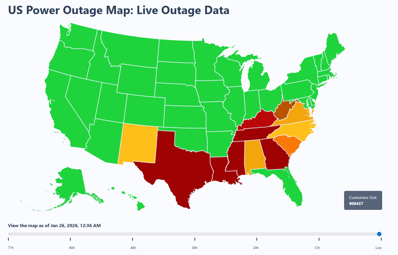 Cel mai afectat stat este Tennessee, acolo unde peste 300.000 de oameni nu au energie electrică. Mississippi și Louisiana sunt, de asemenea, alte două state afectate de această problemă, fiecare cu peste 100.000 de oameni fără curent.