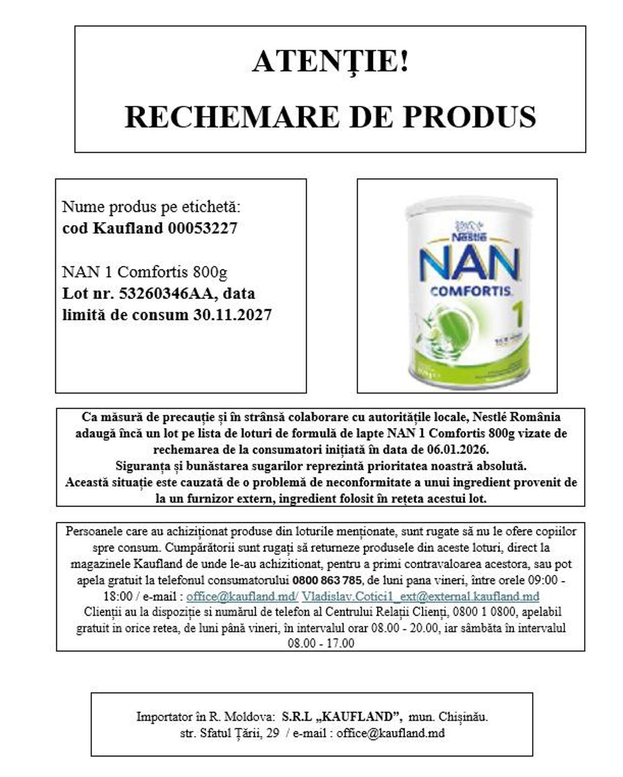 Este vorba despre laptele praf NAN 1 Comfortis, ambalaj de 800 g, comercializat în magazinele Kaufland, cu codul de pe etichetă 00053227, lotul 53260346AA și data-limită de consum 30 noiembrie 2027.