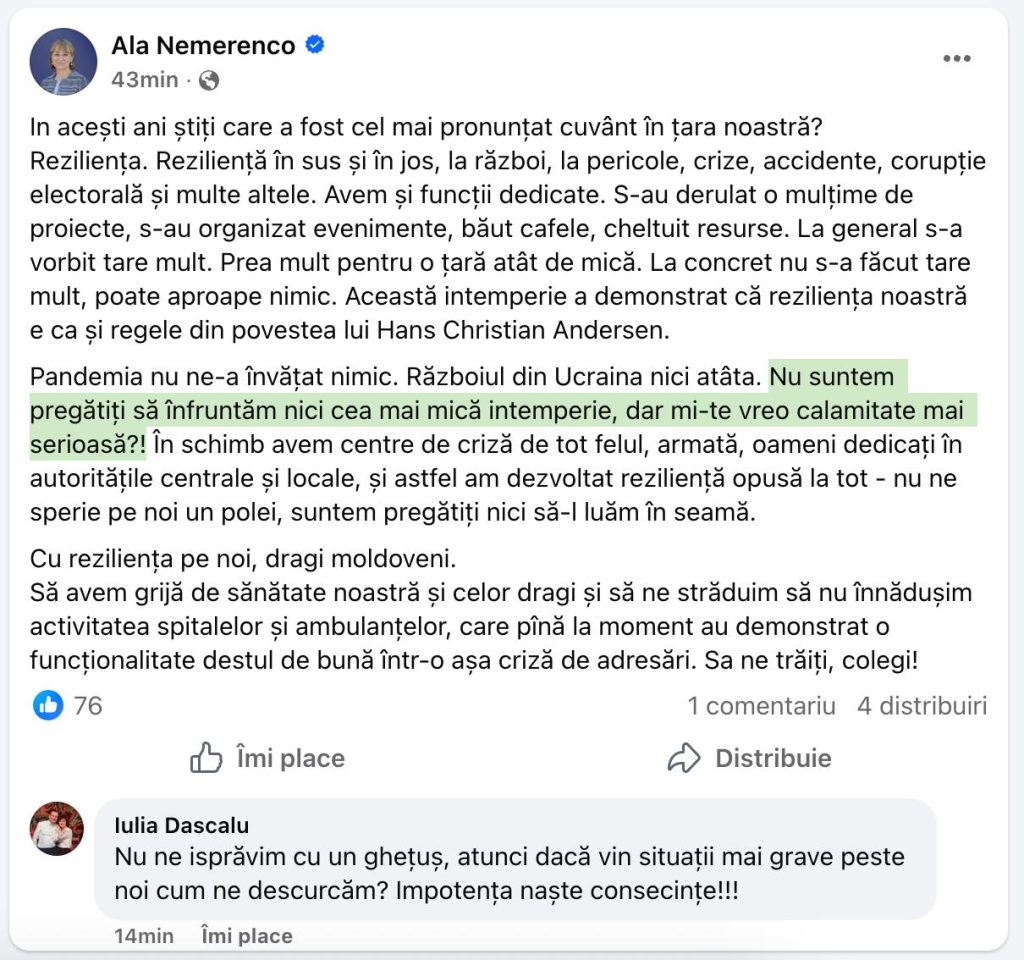 Fostul ministru al Sănătății, Ala Nemerenco, a criticat modul în care este gestionată situația de criză din aceste zile, afirmând că, deși guvernarea vorbește constant despre „reziliență”, aceasta nu se reflectă în capacitatea reală a statului de a face față unor intemperii.