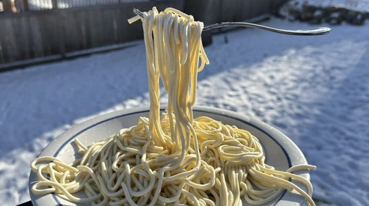 „Evident că a trebuit să fac experimentul cu pastele”, a scris McDermed într-o postare pe platforma X, alături de imagini care o arată ținând în aer o furculiță cu paste complet înghețate.