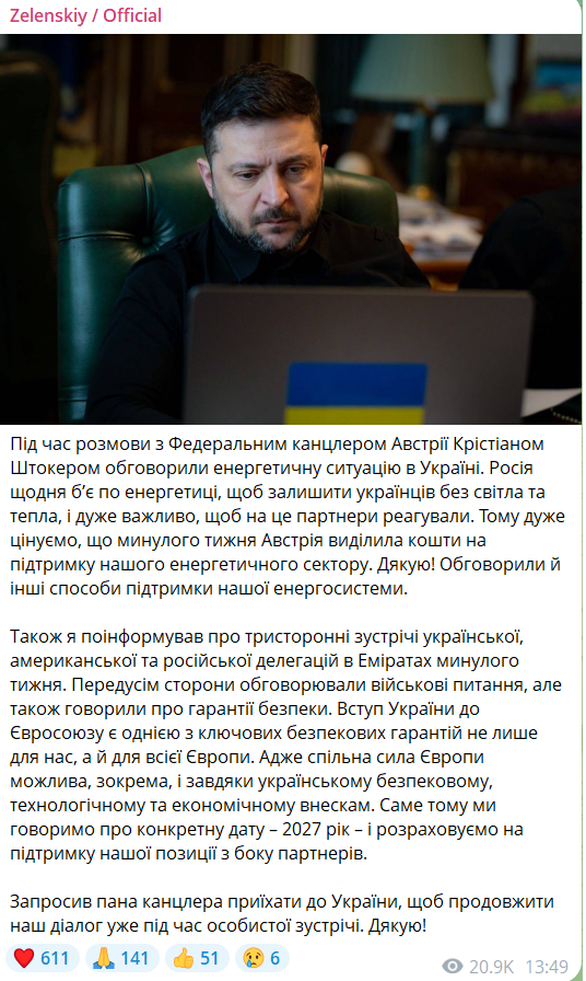 Zelenski a declarat că a avut discuții cu oficialul austriac, principalele subiecte vizând atacurile zilnice ale Rusiei asupra infrastructurii energetice din Ucraina, care au lăsat populația fără lumină și căldură. Totodată, liderul ucrainean a anunțat că Austria a alocat fonduri pentru sprijinirea sectorului energetic din Ucraina încă de săptămâna trecută. În cadrul discuțiilor online, a fost abordată și tema întâlnirilor trilaterale dintre Rusia, Ucraina și SUA, care au avut loc la Abu Dhabi pe 23 ianuarie.