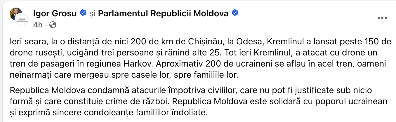 „Ieri seara, la o distanță de nici 200 de km de Chișinău, la Odesa, Kremlinul a lansat peste 150 de drone rusești, ucigând trei persoane şi rănind alte 25. Tot ieri Kremlinul, a atacat cu drone un tren de pasageri în regiunea Harkov. Aproximativ 200 de ucraineni se aflau în acel tren, oameni neînarmați care mergeau spre casele lor, spre familiile lor. Republica Moldova condamnă atacurile împotriva civililor, care nu pot fi justificate sub nicio formă și care constituie crime de război. Republica Moldova este solidară cu poporul ucrainean și exprimă sincere condoleanțe familiilor îndoliate”, a transmis speakerul.