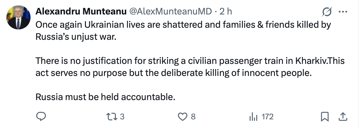 „Viețile ucrainenilor sunt distruse, iar familiile și prietenii sunt uciși în războiul nedrept al Rusiei. Nu există nicio justificare pentru lovirea unui tren civil cu pasageri la Harkov. Acest act nu servește niciunui scop în afară de uciderea deliberată a unor oameni nevinovați. Rusia trebuie trasă la răspundere”, a transmis prim-ministrul Moldovei, Alexandru Munteanu.