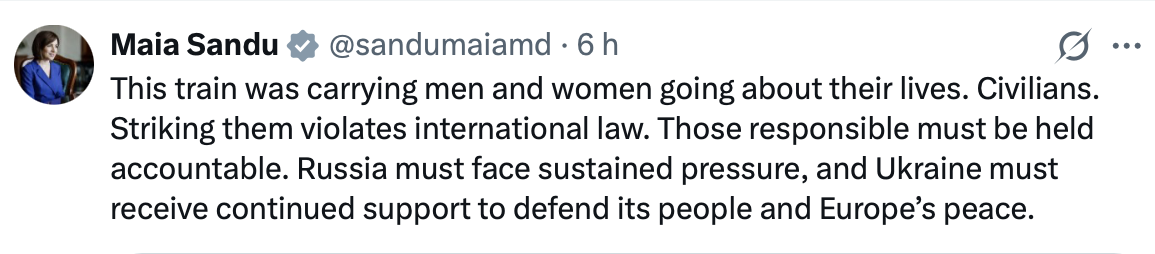 „Acest tren transporta bărbați și femei care își vedeau de viață. Civili. Lovirea lor încalcă dreptul internațional. Cei responsabili trebuie să fie trași la răspundere. Rusia trebuie să se confrunte cu presiuni susținute, iar Ucraina trebuie să primească sprijin continuu, pentru a-și apăra poporul și pacea Europei”, a spus Maia Sandu.